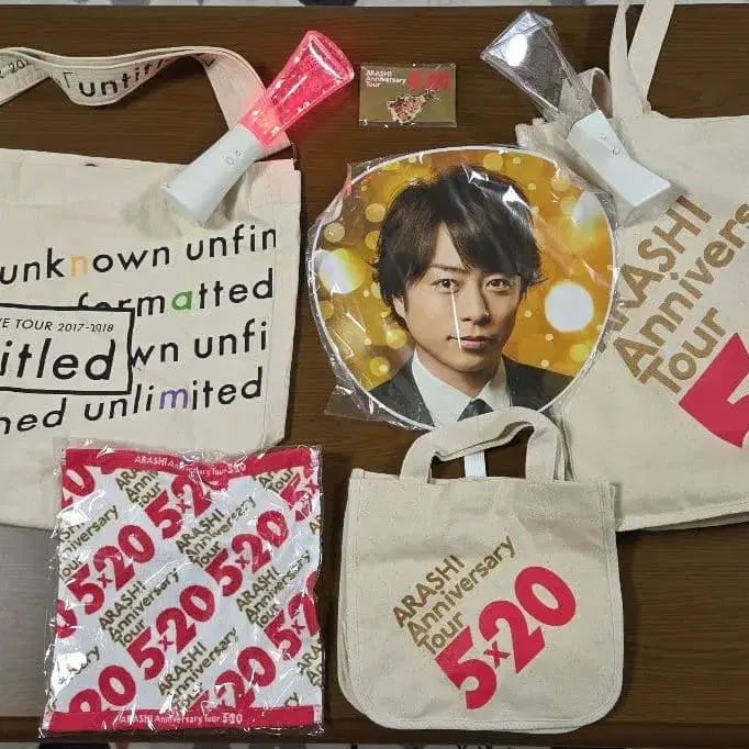 자동 번역되었어요. 원문보기ARASHI 라이브 투어 굿즈, 토트백 2개 세트와 응원봉, 팬 배지, 부채 포함.
