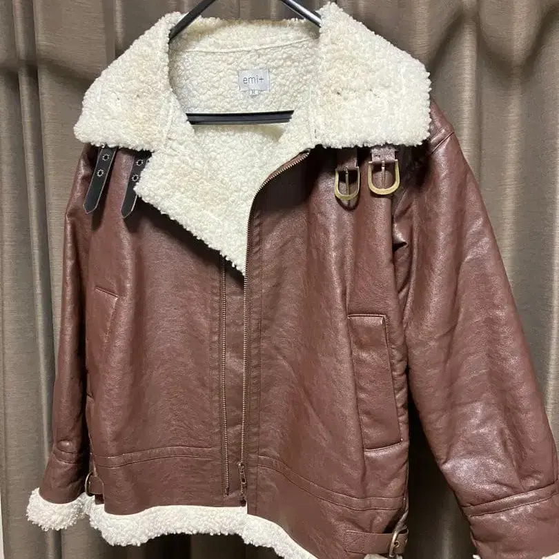보아 옷깃과 지퍼가 달린 브라운 합성 피혁 자켓. - 색상: 브라운 - 소재: 합성 피혁 - 디자인: 보아 옷깃 부착, 지퍼식 - 특징: 사이드 포켓 부착, 조정 가능한 스트랩 사이즈 - M 방문해 주셔서 감사합니다. 검토 부탁드립니다¨̮⃝