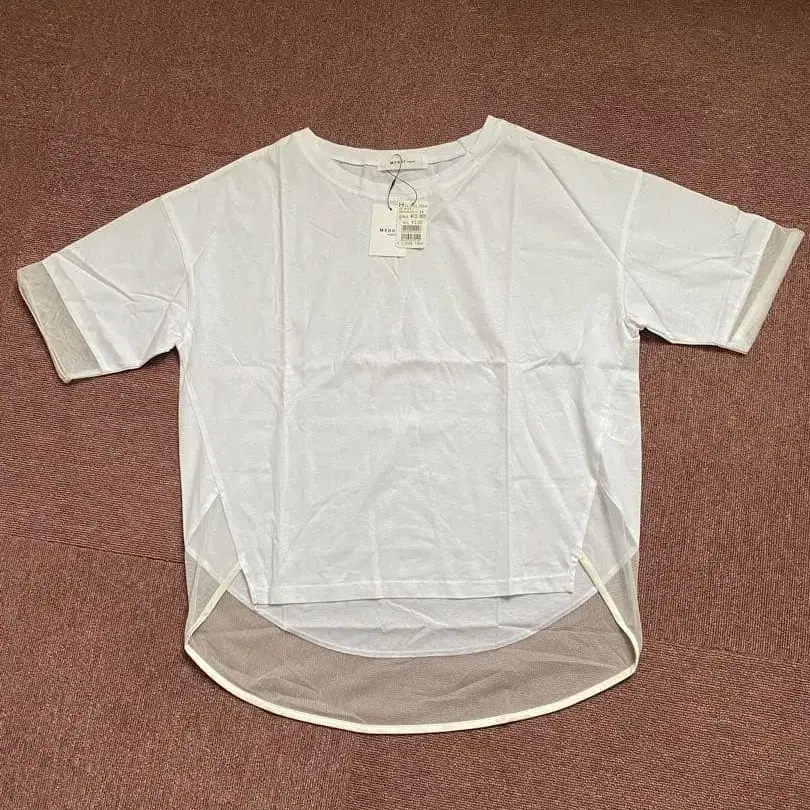 화이트 T셔츠. 소매와 밑단에 시스루 디테일이 있습니다.