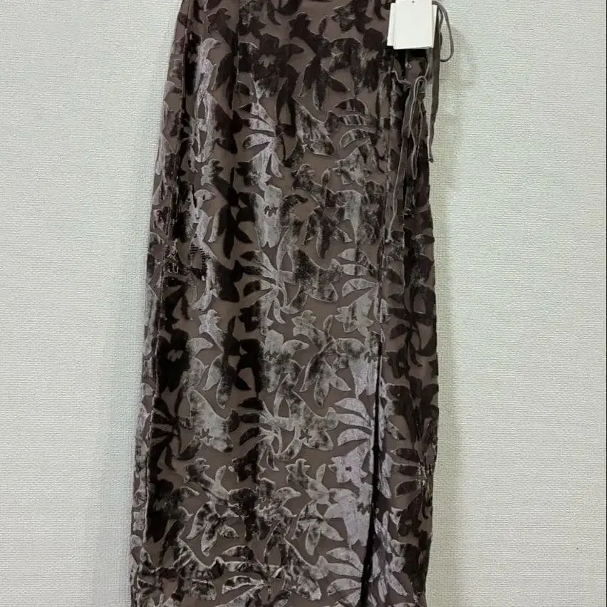 벨로아 소재에 오리지널 플라워 무늬로 오팔 가공을 한 원단을 사용했습니다. 털이 있는 벨로아 부분과 비치는 부분의 소재감의 갭이 귀여운 소재입니다. 랩 디자인의 타이트 스커트로 프론트에 장식된 벨로아 리본도 소재감을 통일한 디자인입니다.