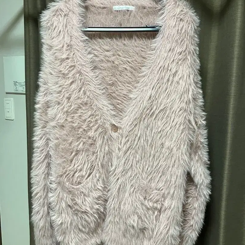 부드러운 퍼 소재의 핑크 가디건, 포켓이 있어 따뜻합니다.