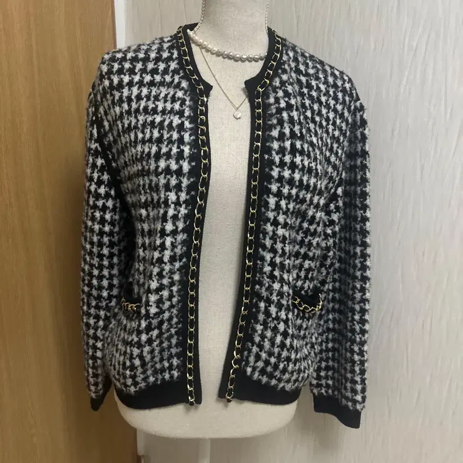 체크 무늬의 노카라 자켓으로, 골드 체인 장식이 특징입니다. - 색상: 블랙, 화이트 - 디자인: 체크 무늬 - 스타일: 노카라 - 포켓: 앞면 포켓 있음 - 장식: 골드 체인 디테일 방문해 주셔서 감사합니다. 계절감 - 겨울 얼룩, 찢김, 냄새 등 - 없음