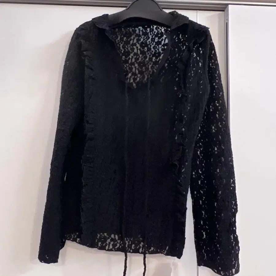 비침이 있는 블랙 레이스 셔츠, 프릴이 달린 후드 디자인. - 색상: 블랙 - 소재: 레이스 - 스타일: 긴팔 - 특징: 비침 있음 방문해 주셔서 감사합니다. 잘 부탁드립니다. 사이즈 - M 야마다야 Ample