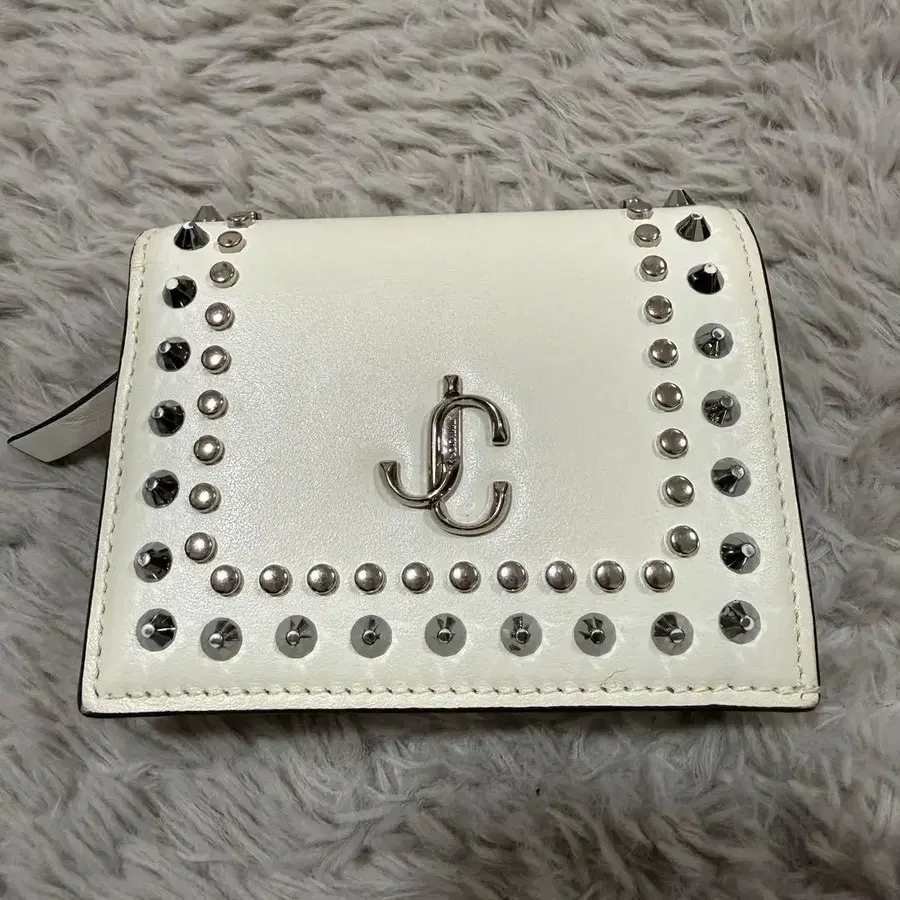 스터드가 달린 화이트 가죽 접이식 지갑.
