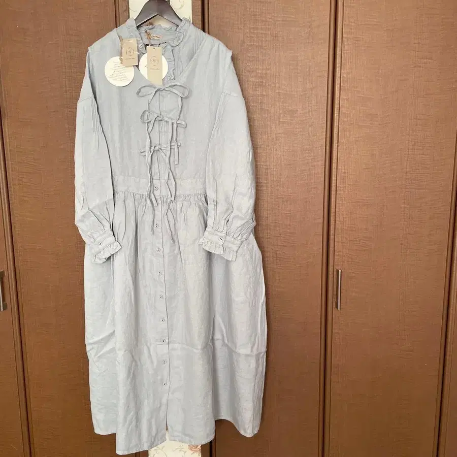 [ SM2 ] 그레이 리본 포함 긴팔 롱 원피스 린넨 100%