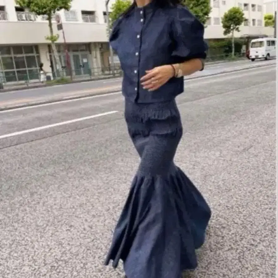 데님 소재의 스트레치가 들어간 다크 블루 머메이드 원피스와 퍼프 슬리브 블라우스 조합입니다.