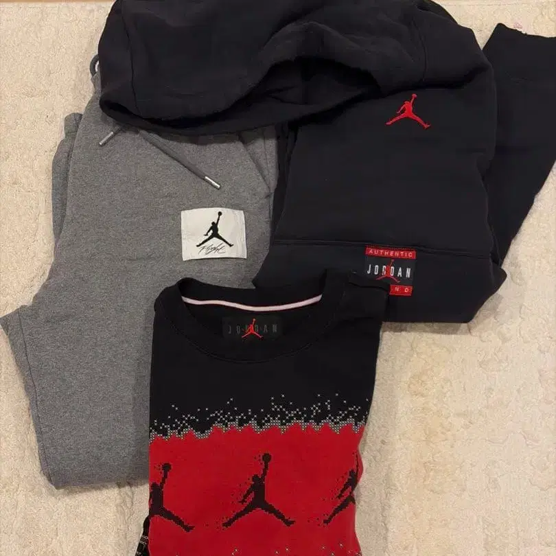 미니멀리스트를 위해 조던 스웨트 팬츠, 스웨트 셔츠, 후디 3종 세트를 판매합니다. 블랙 후디는 거의 미사용 상태이지만 데미지 가공이 되어 있습니다. 모두 공식 매장에서 구매했으며, 일본 사이즈 L입니다.