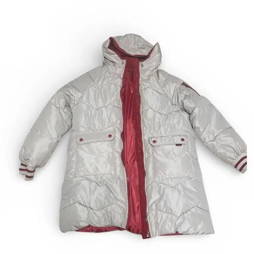 실버 색상의 후드 부착 다운 자켓, 빨간색 안쪽이 특징. - 색상: 실버 - 안쪽 색상: 빨간색 - 디자인: 후드 부착, 지퍼 개폐 - 소재: 나일론 방문해 주셔서 감사합니다. 사이즈 - XL(LL)