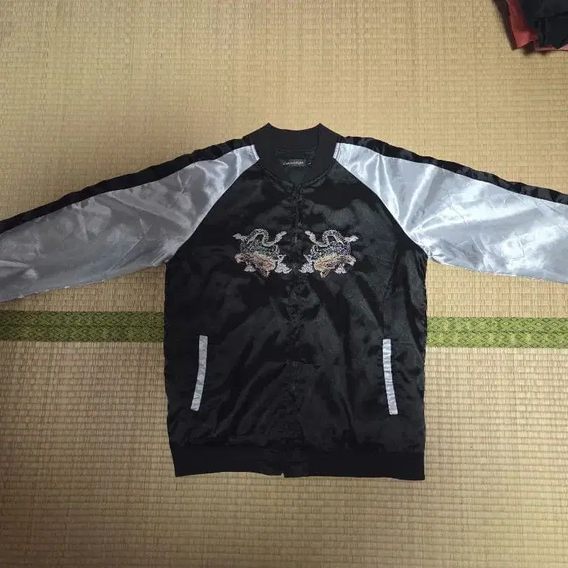 자수 드래곤 디자인의 새틴풍 스카잔. - 색상: 블랙, 실버 - 디자인: 자수 드래곤 디자인 - 소재: 새틴풍 원단 - 스타일: 스카잔 - 소매 디자인: 실버 소매 방문해 주셔서 감사합니다.