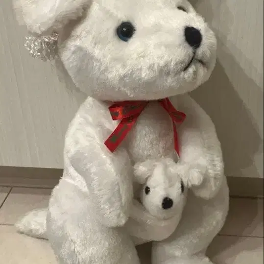 어린이를 안고 있는 캥거루 봉제 인형입니다. 산타 모자와 빨간색 리본을 착용하고 있습니다. 안에 방울이 들어 있어 소리가 납니다. 사이즈는 세로 30cm 정도입니다. 구매 후 봉투에 넣어 보관했기 때문에 얼룩 등은 보이지 않았습니다.