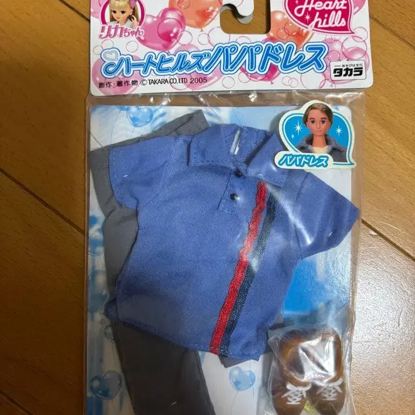 파란색 셔츠와 그레이 팬츠, 브라운 신발이 세트인 리카짱 옷 갈아입기 의류입니다.