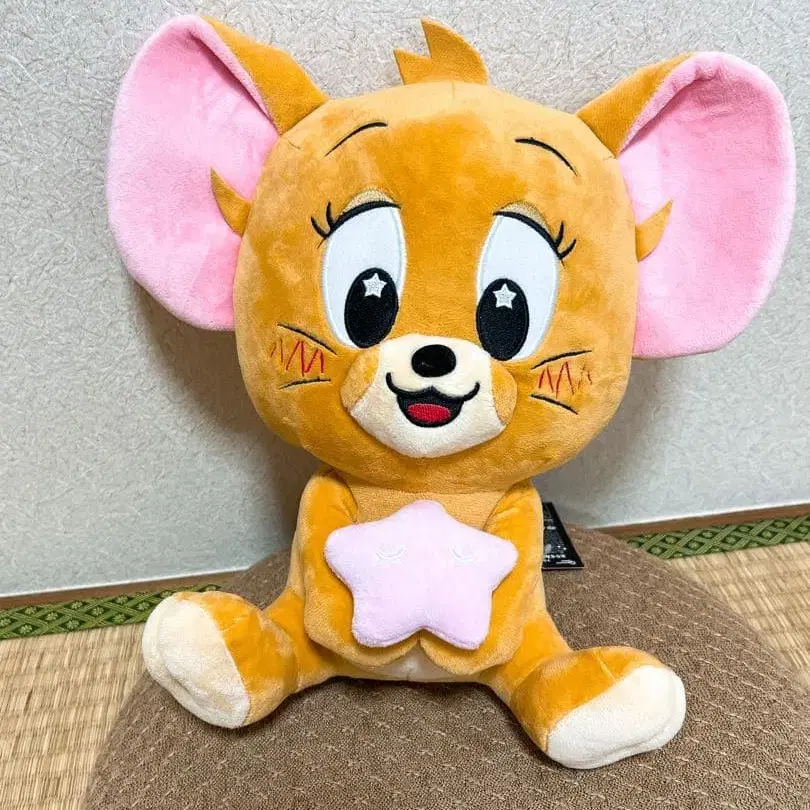 자동 번역되었어요. 원문보기오렌지와 핑크 색감이 특징인, 별 모양 쿠션을 가진 톰과 제리의 제리 봉제 인형입니다.