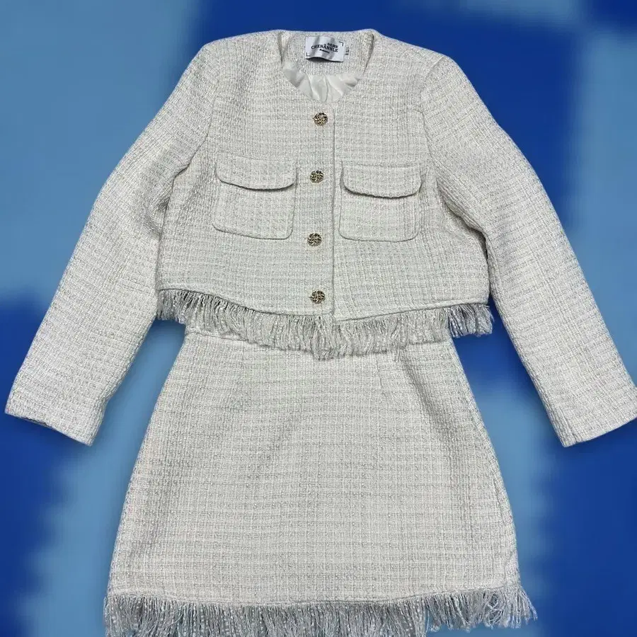 프린지 장식의 화이트 스커트 수트, 골드 컬러 버튼과 포켓 포함. - 색상: 화이트 - 디자인: 프린지 장식 스커트 수트 - 포켓: 앞면에 포켓 2개 - 버튼: 골드 컬러 버튼 방문해 주셔서 감사합니다.