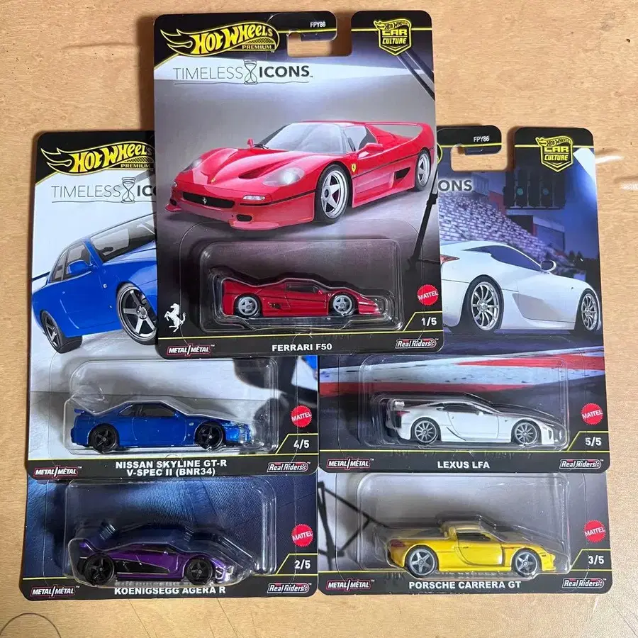 핫휠 5대 세트, 타임리스 아이콘 시리즈. - 모델명: Ferrari F50 - 모델명: Nissan Skyline GT-R V-SPEC II (BNR34) - 모델명: Lexus LFA - 모델명: Koenigsegg Agera R - 모델명: Porsche Carrera GT 방문해 주셔서 감사합니다. 종류 - 프리미엄 카 스케일 - 1/64