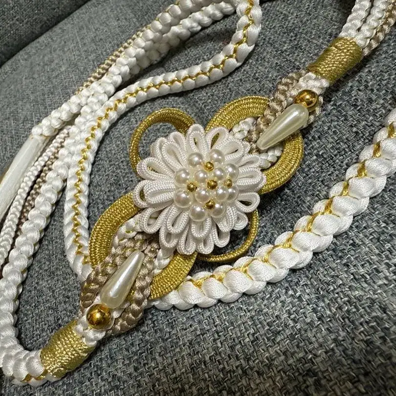 화이트와 금색 꽃 모티브, 펄 장식의 일본풍 허리띠. - 색상: 화이트와 금색 - 디자인: 꽃 모티브와 펄 장식 - 소재: 합성섬유와 금속 부품 - 스타일: 일본풍 허리띠 - 길이: 긴 디자인 방문해 주셔서 감사합니다.