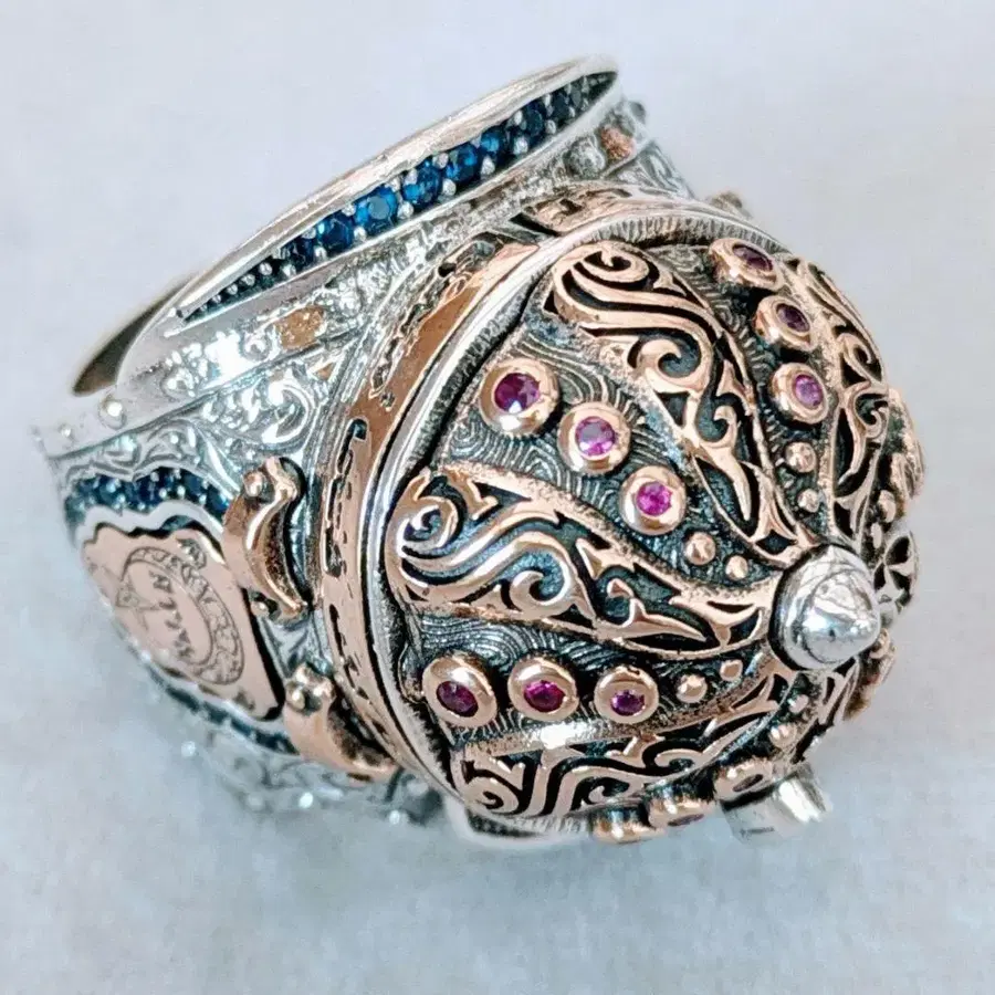 터키 이스탄불의 공방에서 925 실버 핸드메이드 반지가 도착했습니다. 오스만 제국의 병사의 투구(돔형 헬멧)를 모티브로 한 독특한 디자인의 반지로, 투구 하단에는 아랍어로 수라 알 파트(승리의 장)가 새겨져 있으며, 측면에는 터키 국기 모티브, 바이저에는 에메랄드 등의 보석이 박혀 있고, 조각 기법을 사용하여 디자인이 완성되었습니다. [ 생산국 ] 터키 공화국 [ 소재 ] 925silver, 루비, 반귀석 [ 사이즈(약) ] 모티브 부분: 세로 2.8cm, 가로 2.3cm, 높이 1.7cm 반지: 23호 이 상품은 엔델샤프의 오리지널 반지입니다. −−−−−−−−−−−−−−−−−−−−−−− #터키 #터키잡화 #실버 #silver #silver925 #반지 #손가락반지 #남성용 #남성반지 #남자반지 #핸드메이드 #장인핸드메이드 #액세서리 #달 #별 #투구 #헬멧 #오스만제국 #오리지널 #엔델샤프