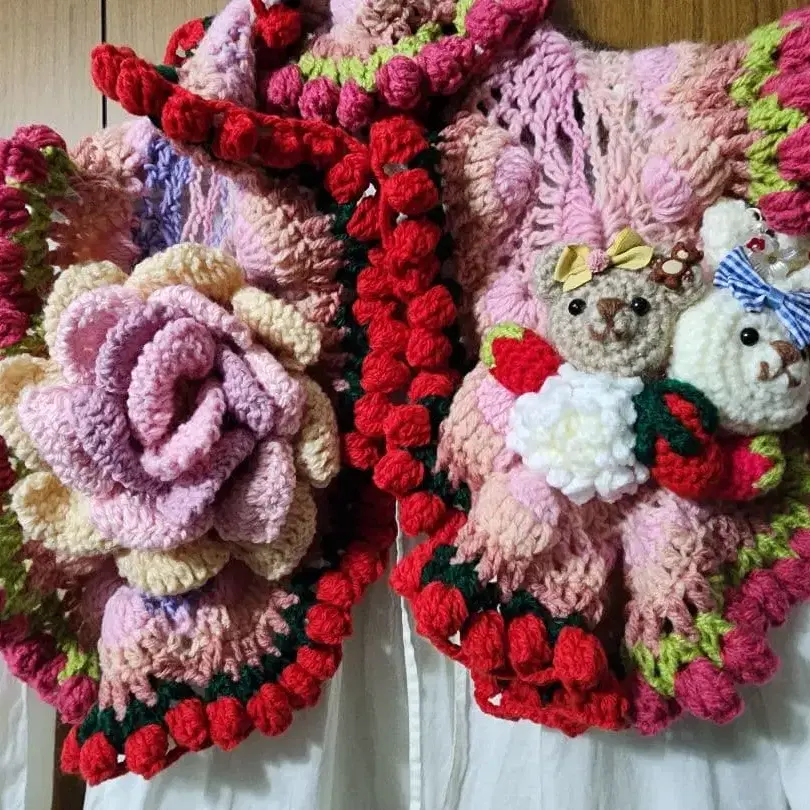 ♡ 핸드메이드입니다 ♡ ★ 재료 수급 문제로 오더는 접수하지 않습니다! ★ 입체 장미 모티브 털실 인형을 짜서 프릴 머플러를 만들었습니다. 핸드메이드입니다. 기성품처럼 완벽하지는 않습니다. 잘 부탁드립니다. 포테치노 사에라 벨파치 SM2 로베르타 간돌피 믹사주 핑크하우스 원더풀 월드 털실 인형 좋아하시는 분께 ♪