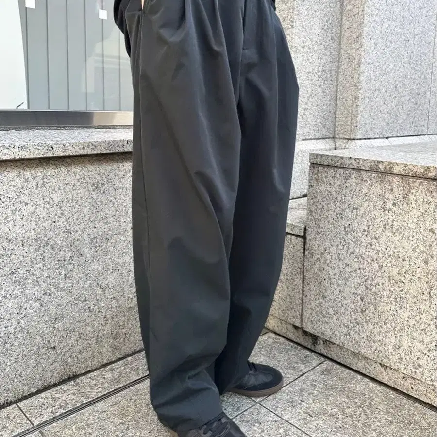 턱을 넉넉하게 넣어 만든 벌룬 실루엣이 눈길을 끄는 릴랙스 팬츠.