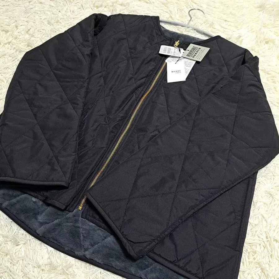 퀼팅 디자인의 블랙 자켓, 골드 지퍼 포함, 사이즈 38. 정가 26000엔 - 사이즈: 38 - 소재: 폴리에스테르 100% - 색상: 블랙 x 차콜 그레이 리버서블 - 디자인: 퀼팅 - 지퍼: 골드 지퍼