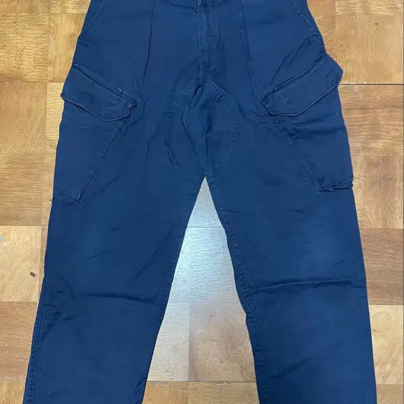 자동 번역되었어요. 원문보기네이비 카고 팬츠, 포켓 4개, 뒷면에 작은 얼룩 있음.