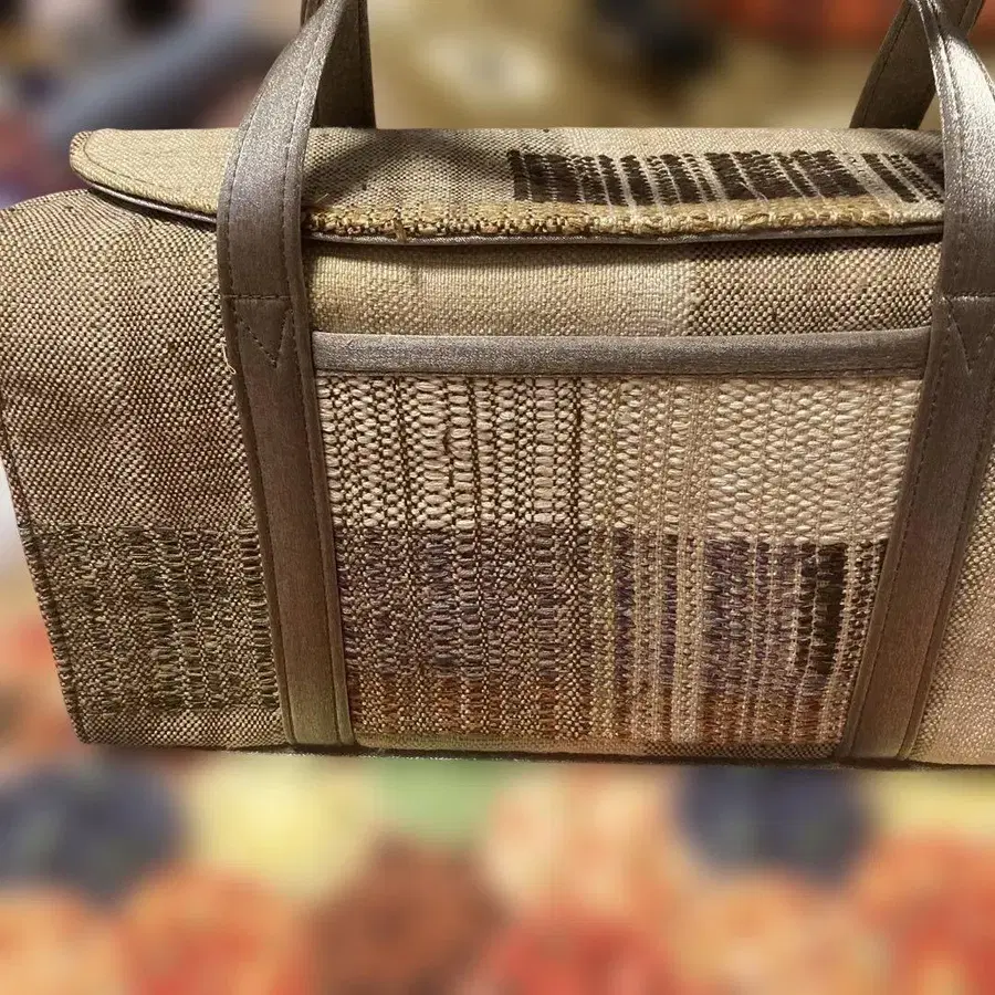 베이지 계열의 스트라이프 무늬 일본 의류용 백, 직물 소재로 더블 핸들 포함. - 색상: 베이지 계열 - 소재: 직물 - 디자인: 스트라이프 무늬 - 손잡이 스타일: 더블 핸들 방문해 주셔서 감사합니다.