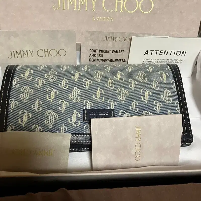 네이비 색상의 장지갑, 로고 패턴이 특징입니다.