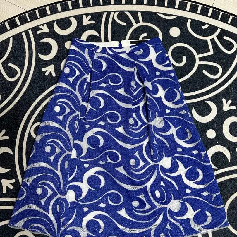 파란색과 흰색 무늬가 특징인 플레어 스커트, 메쉬 원단으로 가벼운 착용감. - 브랜드: BCBGMAXAZRIA - 색상: 파란색과 흰색 무늬 - 소재: 메쉬 원단 - 스타일: 플레어 스커트 - 기장: 무릎 기장 방문해 주셔서 감사합니다. 사이즈 - XS(SS)