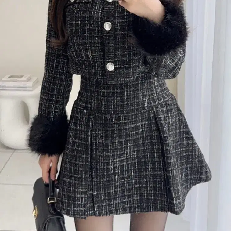 다리치 숏 트위드 자켓 도킹 퍼 트위드 미니 스커트