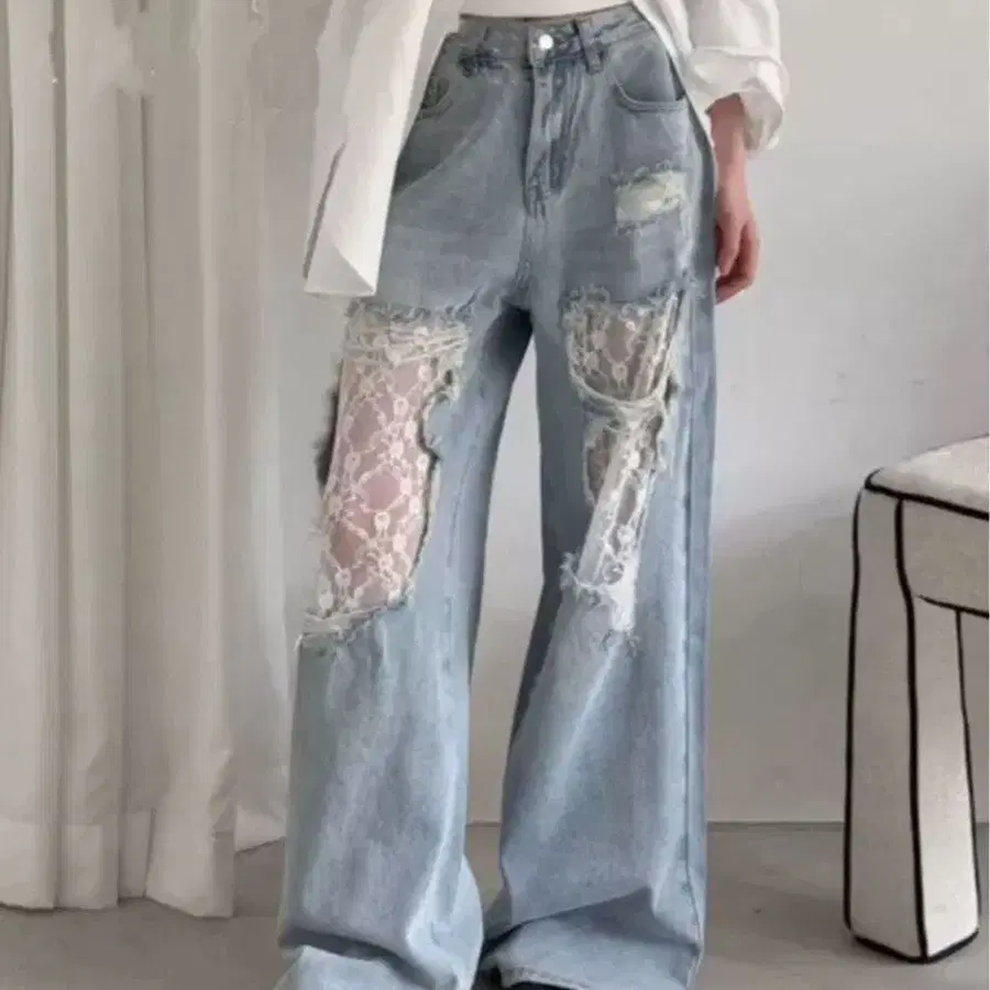 Forever21 데미지 레이스 데님 팬츠 블루 레이스 데님 발레코어