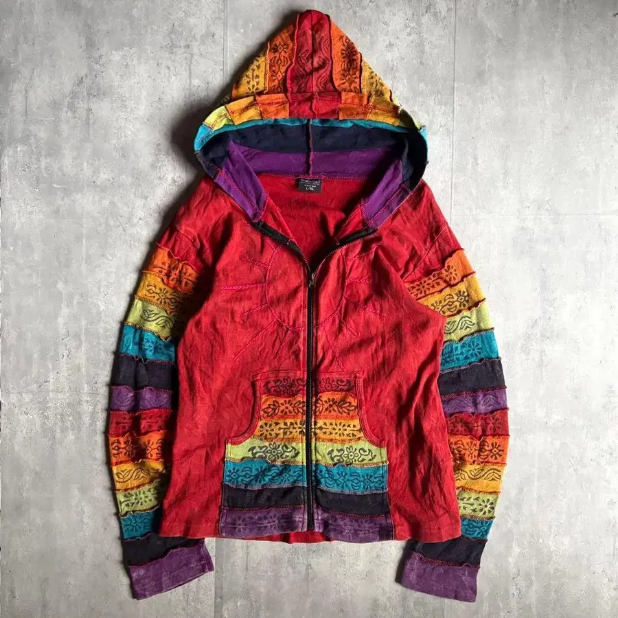 네팔제 사이키델릭한 후드티입니다. 후염한 듯한 색상 불균일이 있는 레드가 매우 좋습니다. 태양 자수도 좋습니다.