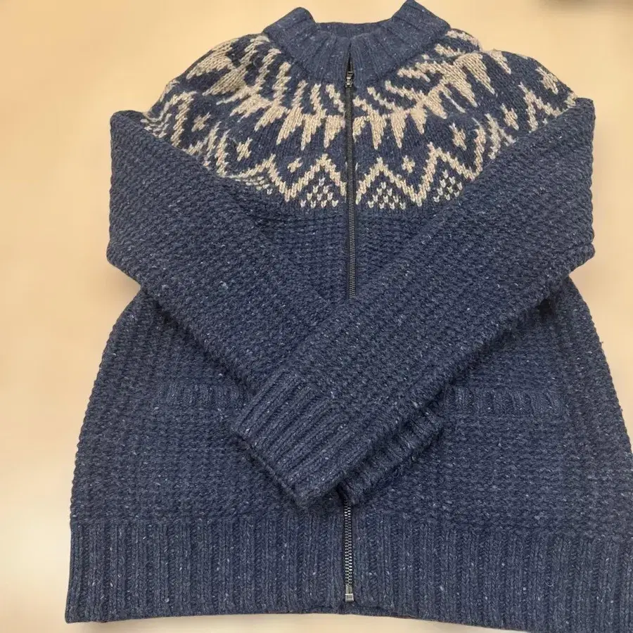 지퍼가 달린 네이비 스웨터, 노르딕 무늬 디자인으로 스타일리시합니다.