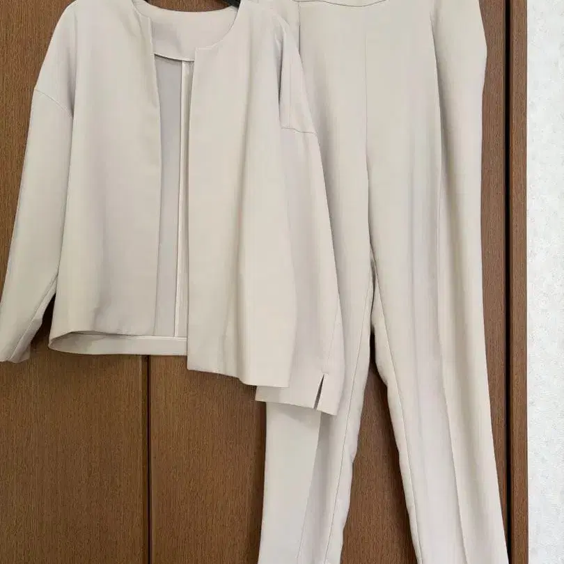 새하얀 색이라기보다는 약간 크림색에 가까운 수트입니다. 자켓은 38, 팬츠는 40 사이즈로 L 사이즈 표기되어 있지만, 평소 M~L 사이즈를 착용하시는 분께 추천합니다.
