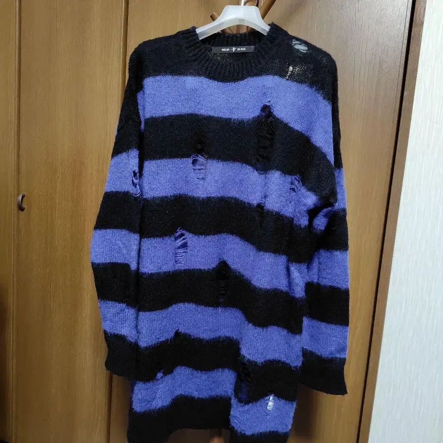 방문해 주셔서 감사합니다. NO ID. 데미지 보더 니트입니다. 2회 정도 착용했습니다. 얇은 소재의 니트 원단으로, 데미지 가공이 되어 있습니다. 색상은 블루 x 블랙이며, 클리닝 완료되었습니다. 공식 치수는 가슴 너비: 60cm 어깨 너비: 63cm 기장: 85cm 소매 길이: 53.5cm 입니다. 냄새 등은 없으며 상태는 좋다고 생각되지만, 어디까지나 중고품이므로 이해해 주시길 부탁드립니다. 가격 인하 요청, 사진 추가 등 있으시면 편하게 댓글 달아주세요. 잘 부탁드립니다.