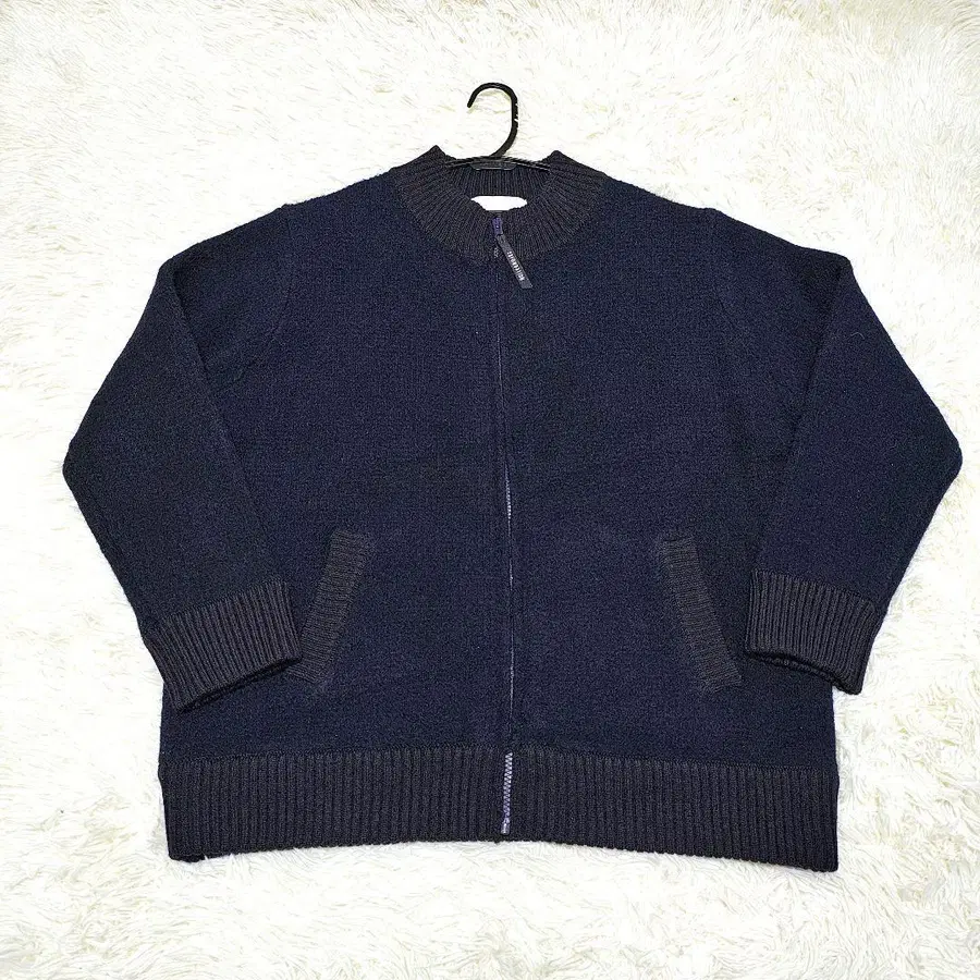 집업 디자인의 다크 네이비 니트 가디건, 포켓이 있어 실용적입니다.
