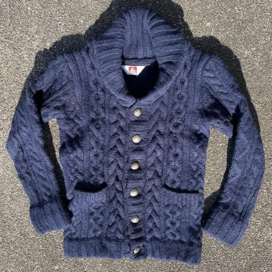 네이비 케이블 니트 가디건, 프론트 버튼이 달린 하이넥 디자인.