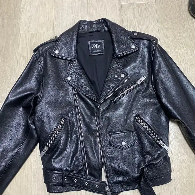 지퍼 포켓과 벨트가 달린 블랙 레더 라이더 자켓. - 브랜드: ZARA - 색상: 블랙 - 스타일: 라이더 자켓 - 소재: 가죽 - 특징: 지퍼 포켓, 벨트 포함 방문해 주셔서 감사합니다. 사이즈 - M 약간 오버 사이즈입니다.