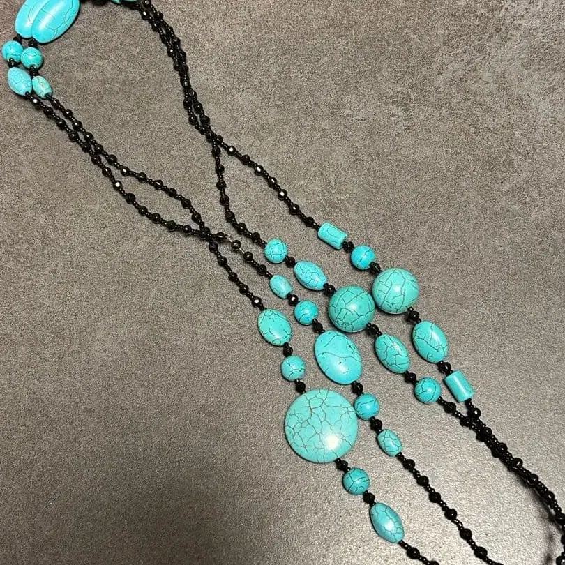 길이가 꽤 길어서 2줄로 겹쳐 촬영했습니다. 터콰이즈? 터키석? 오닉스? 와 같은 돌로 만든 목걸이입니다. 전문가가 아니므로 진위 여부는 사진으로 확인해 주십시오. 전체 길이는 약 75cm입니다.
