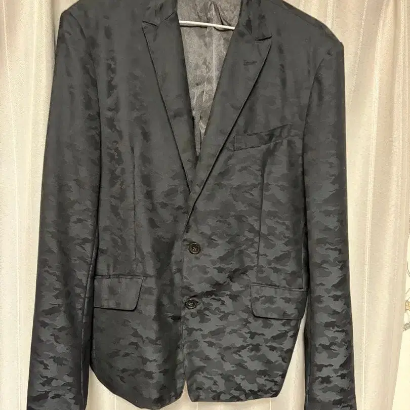 사이즈 - M 사이즈 표기는 46입니다. 줄리 블랙 세일 때 구매한 것 같은 느낌이지만, 택에 표기가 없어 확실하지 않습니다. 원단에 무늬가 들어가 있습니다.