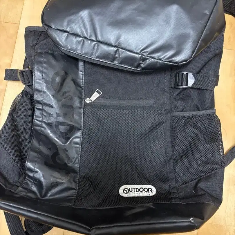 나일론 소재의 블랙 백팩, 외부에는 지퍼 포켓과 메쉬 디자인이 있습니다. - 브랜드: OUTDOOR - 색상: 블랙 - 안쪽 색상: 라이트 블루 - 포켓: 외부에 지퍼 포켓 있음 - 소재: 나일론 - 디자인: 메쉬와 광택 소재의 콤비네이션 방문해 주셔서 감사합니다. 색상 - 블랙 계열 얼룩, 찢김 등 - 없음