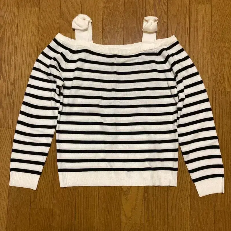 리본 포함 오프숄더 보더 니트 스웨터
