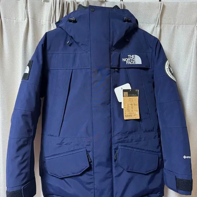 언터크 티카 파카 GORE-TEX 소재를 사용한 방수, 방풍 네이비 다운 자켓.