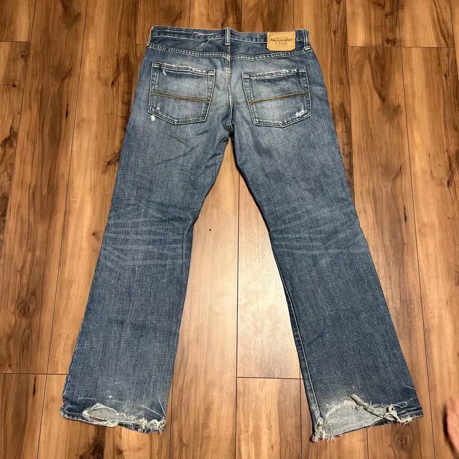 데미지 가공이 들어간 블루 스트레이트 데님.