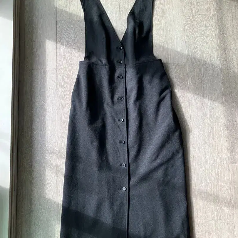 심플한 블랙 슬리브리스 롱 원피스, V넥 디자인과 버튼이 있습니다.