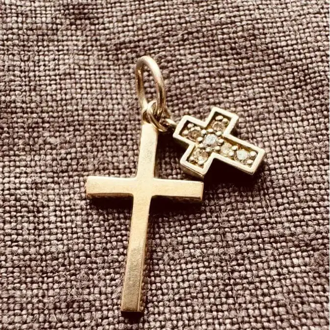 아가트의 레이어드한 듯한 크로스 모티브의 목걸이입니다. 다이아몬드 6개가 세팅되어 있습니다. 각인: agete, K10, SV, .06 크로스 모티브 크기: 1.8 x 1.0, 0.8 x 0.6 ※ 개인 측정 ※ 오링 미포함 측정 부속물 없음 참만 발송됩니다.
