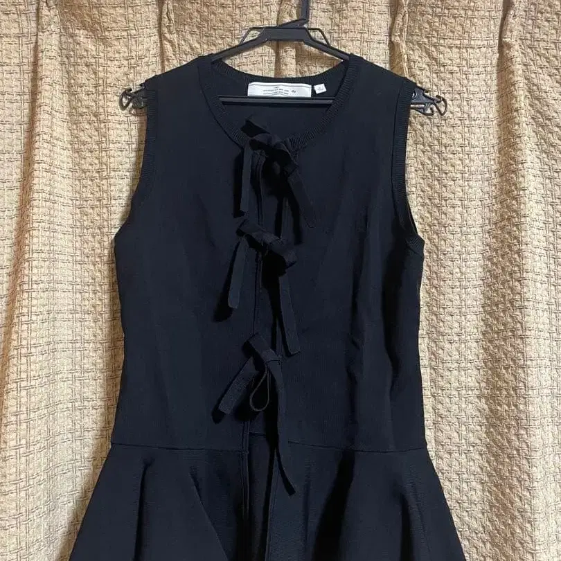 프릴 밑단과 리본이 포함된 블랙 슬리브리스 상의.