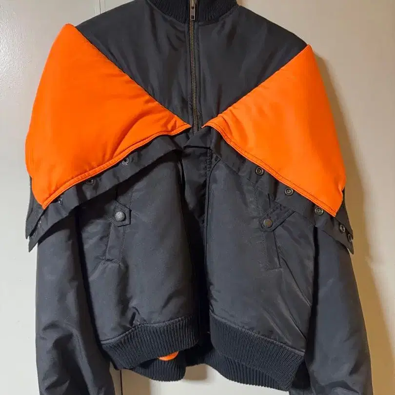 오렌지와 블랙의 플라이트 자켓 스타일, 나일론 소재로 캐주얼에 최적입니다.