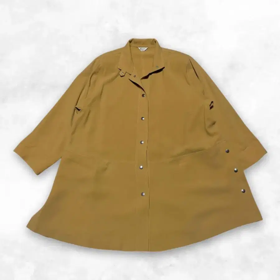 차분한 머스타드 컬러와 뒷면의 버튼 디자인, 봉긋하게 퍼지는 A라인 실루엣이 매우 고급스러운 아이템입니다. 일본제이며 마감이 좋고, 어깨 패드가 내장되어 있어 예쁜 실루엣을 유지할 수 있습니다.