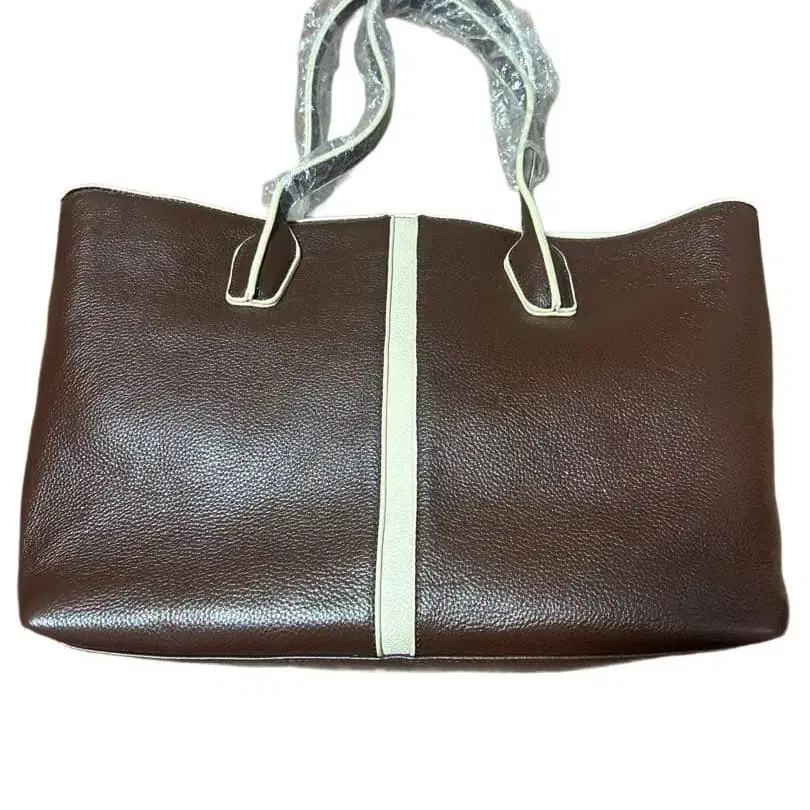 브라운에 아이보리 센터 스트라이프 디자인의 토트백입니다. 미사용 상태입니다. 가방 모양이 망가지지 않도록 안에 충전재(모양 망가짐 방지용 종이)를 넣은 상태로 보관되어 있습니다. - 색상: 브라운 - 안쪽 색상: 브라운 - 안쪽 포켓: 있음 - 핸들: 김 - 사이즈: 가로 32cm, 세로 25cm, 폭 15cm 잘 부탁드립니다!