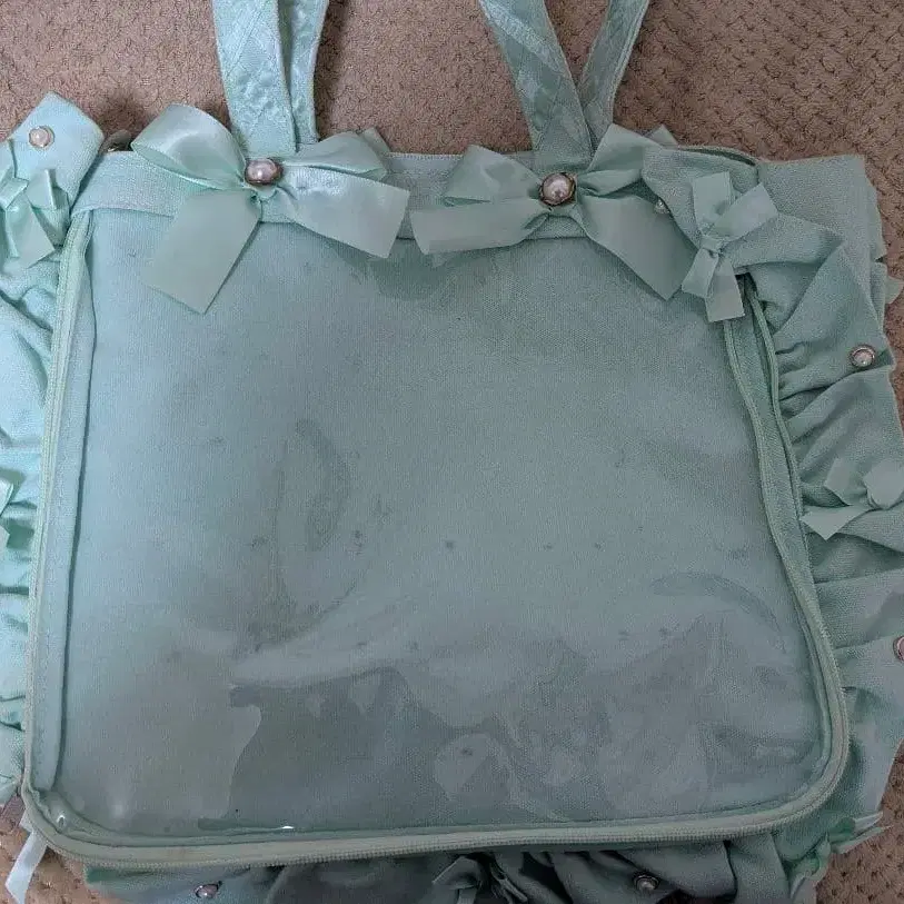 A4 프릴 디자인 이타백용 토트백 (데코레이션) 그린 즉시 구매 OK 사용감, 캔뱃지로 가려지는 부분에 얼룩이 있습니다