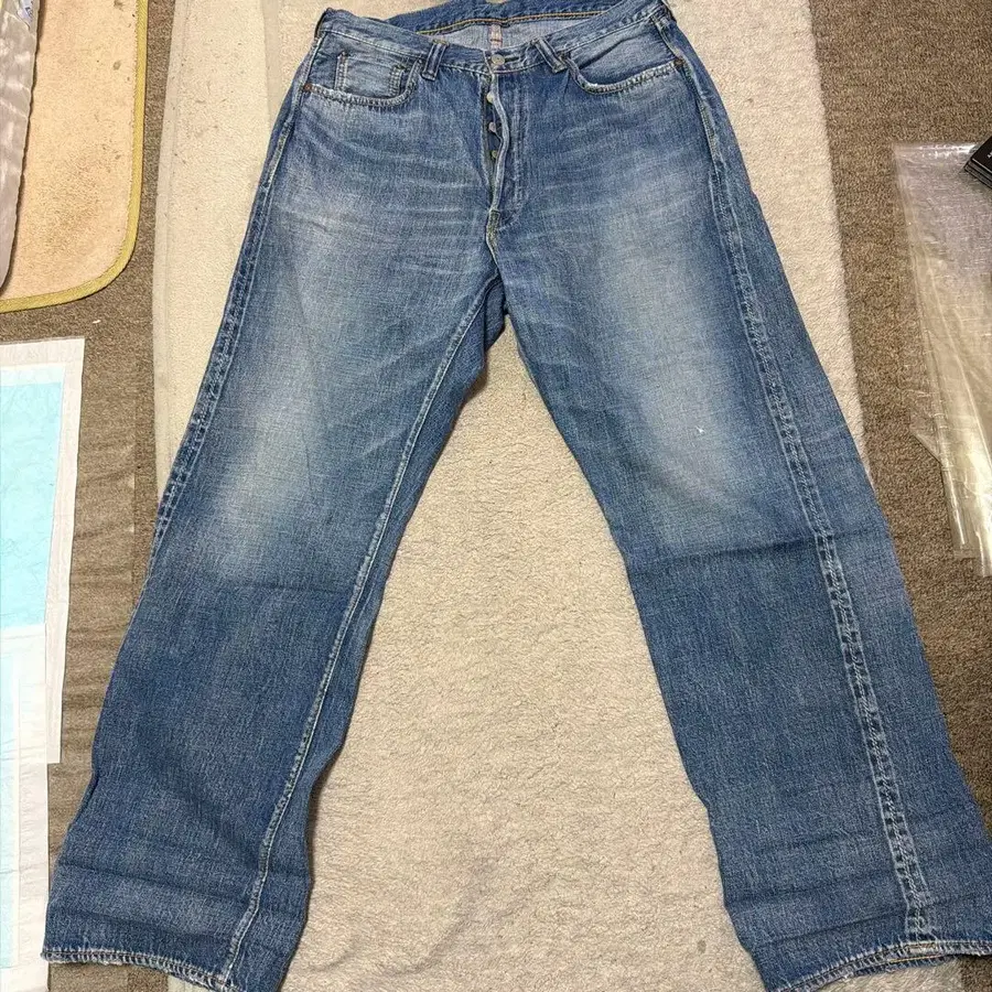 해당 상품은 풀카운트의 11.5온스 0105SS입니다. 새상품으로 구매했으나 사이즈가 너무 커서 5~6회 정도 착용한 후 보관했습니다. 밑단은 접어서 보관했기 때문에 이미지와 같이 접힌 부분이 있습니다. 허리 41 밑위 30 인심 78 허벅지 폭 34 밑단 폭 23